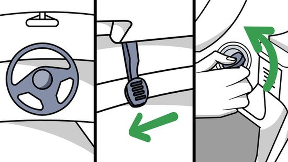 Press the clutch pedal fully with your left foot before starting the engine. This action disconnects the engine from the wheels. It prevents the car from moving suddenly and protects the gearbox. Keep the clutch pressed until you are ready to move.
