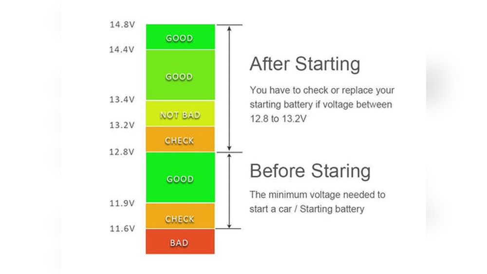 If the voltage is between 12.6 and 12.8, the battery is good. If it is below 12.4, the battery needs charging or replacement.